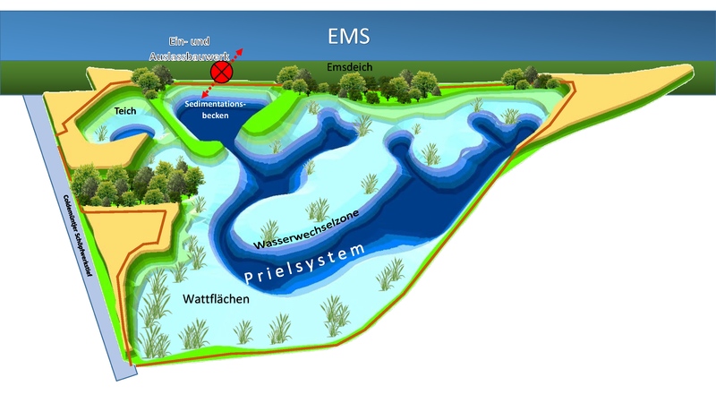 Nach rund drei Jahren Bauzeit sollen rund 36 ha der ehemaligen Emsschleife in der Gemeinde Westoverledingen wieder dem Tidegeschehen unterworfen werden. Dazu wird in späteren Bauphasen ein Prielsystem im Polder ausgehoben. Der dabei anfallende Bodenaushub verbleibt teilweise im Polder. Die übrigen Erdmassen werden zur Verstärkung der Außenberme des Emsdeiches (Maßnahme der Overledinger Deichacht) wie auch zur Verbesserung der Bewirtschaftbarkeit umliegender landwirtschaftlicher Flächen genutzt. Über ein Ein- und Auslassbauwerk im Deich soll die Tide dann frei in den Polder schwingen können. Das Emswasser läuft zunächst in ein Sedimentationsbecken, um den Schwebstoffeintrag in den Polder gering zu halten. Anschließend kann sich das Wasser über ein Prielsystem im Polder verteilen.