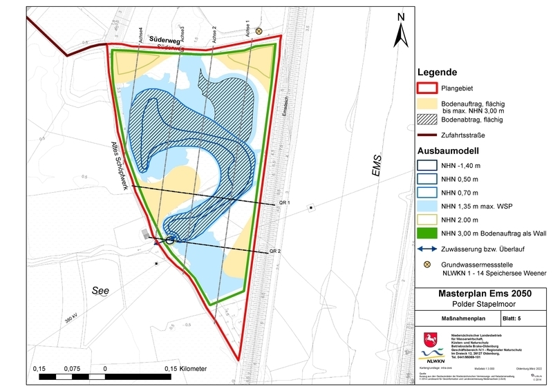 Der Süßwasserpolder, der nahezu ausschließlich aus Regenwasser gespeist wird und – vorausgesetzt im Holthuser Tief befindet sich ausreichend Wasser – auch aus dem Tief aufgefüllt werden darf, ist das zweite Masterplan-Polderprojekt nach dem Tidepolder Coldemüntje, dessen Bau inzwischen begonnen hat. Der Aushub wird für die Geländemodellierung und die Anlage eines umlaufenden Walles genutzt, der eine Kronenhöhe von drei Metern über Normalnull bekommt und damit nur etwa 1,25 bis 1,50 Meter aus dem Gelände herausragen wird. Ganz besonderes Augenmerk wird darauf gelegt, dass die Kleischicht unter der Gewässersohle so mächtig bleibt, dass kein Wasser aus dem Gewässer versickern kann. So wird eine Gefährdung jenes Grundwasserleiters ausgeschlossen, aus dem das Wasserwerk in Weener Trinkwasser gewinnt. Drei Messbrunnen, zwei direkt an der Grenze und einer außerhalb des Polders, kontrollieren regelmäßig den Grundwasserzustand. Auch dessen Qualität wird geprüft. Wegen der Trinkwassergewinnung wurde auch der zunächst angedachte Anschluss des Polders an das Tidegeschehen der Ems bis auf Weiteres verworfen.