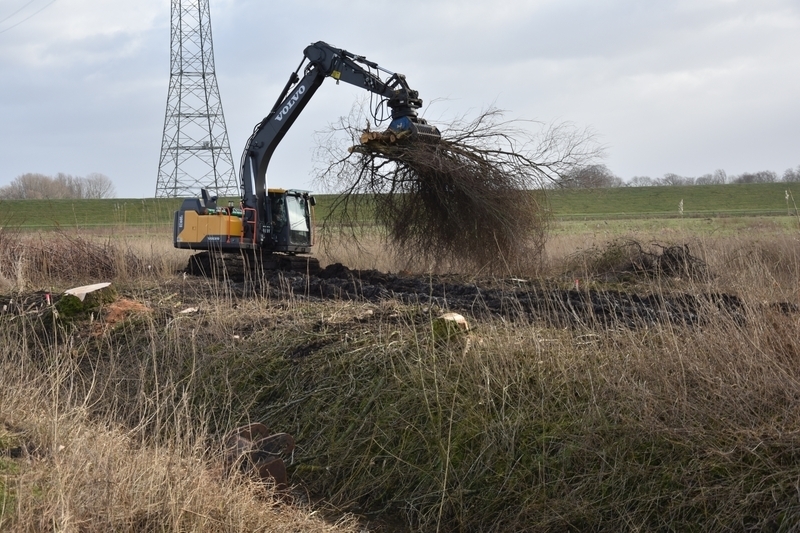 Ein weiteres Masterplan Ems-Projekt geht in die Umsetzung. Nachdem die Planungen vergangenen Herbst genehmigt wurden, haben nun die Vorarbeiten für den Bau des Süßwasserpolders Stapelmoor südlich von Weener begonnen. Zunächst wurden Büsche und Bäume, die in der ehemaligen Außenmuhde des Holthuser Tiefs auf dem 18 Hektar großen Gelände an der Ems aufgekommen sind, gerodet und zu großen Haufen zusammengefahren. In Kürze werden sie geschreddert und dann abtransportiert.