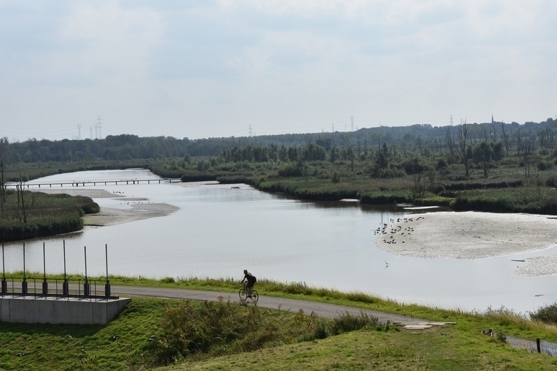 Flussaufwärts von Antwerpen, da wo die Schelde plötzlich schmaler wird und die Wassermassen sich vom weiten in das enge Flussbett zwängen müssen, war früher einer der Hotspots der Überschwemmungen. Menschen kämpften hier, über 100 Kilometer von der Mündung entfernt, mit Sturmfluten vom Meer und Hochwässern aus dem Binnenland. Deichbrüche und überschwemmte Dörfer waren nicht selten. Als eines der insgesamt 14 Bauwerke, die den Flutgefahren vorbeugen sollen, gilt der in Teilen noch im Bau befindliche Polder Waal-Zwijn nahe der Gemeinde Hamme, der aus mehreren Flächen besteht: Das am nächsten zur Schelde gelegene Gebiet wurde ausgedeicht und dem freien Einfluss der Tide überlassen. Hier sind seit der Öffnung vor eineinhalb Jahren auf 25 Hektar ausgedehnte Süßwasserwatten entstanden, von Prielen durchzogen und von den Seiten her bewachsen: so wird auf natürliche Weise eine Flussmarsch entstehen. Der Hauptdeich wurde vom Fluss weit zurückgelegt, um dem Fluss Raum zu geben, und schützt jetzt direkt die Dörfer. Zwischen dem Watt und dem Deich wurde ein Überlaufpolder hergestellt; ihn umgibt ein Deich mit geringerer Höhe, der bei Hochwasser überströmt wird und so den Flusspegel senkt. Das Gebiet ist 140 Hektar groß. Wenn der Flusspegel sinkt, wird das Wasser über Auslassbauwerke wieder hinausgelassen.