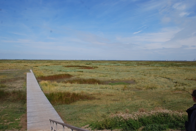 Der Polder liegt zwischen der Schelde und dem Ort Kruibeke. Und vielleicht hat sich die Lage auch beruhigt, weil der Polder zu einem beliebten Naherholungsgebiet geworden ist. Radfahrer, Skater und Fußgänger sind während des Besuchs der NLWKN-Delegation auf dem Deich unterwegs, genießen den Sommertag und die wechselnden Naturimpressionen, die der Polder bietet. Ein Weg aus Holzbohlen inklusive Brücke führt über den Priel und durch das Röhricht, Wasservögel werden durch Ferngläser beobachtet, Naherholung ist hier wichtig. Denn in Kruibeke – wie an vielen anderen Stellen an der Schelde – wird deutlich, wie nah sich Menschen, Natur und Industrie an der Schelde kommen. Während auf dem einen Ufer die Polderflächen in der Sonne glitzern, befinden sich auf dem anderen Ufer der Schelde ein Kraftwerk, eine Werft und weitere Stätten des produzierenden Gewerbes. Vom Polder Coldemüntje sieht man zwar auch das Papierwerk in Weener, aber wieder stößt man hier auf eine ganz andere Dimension.
