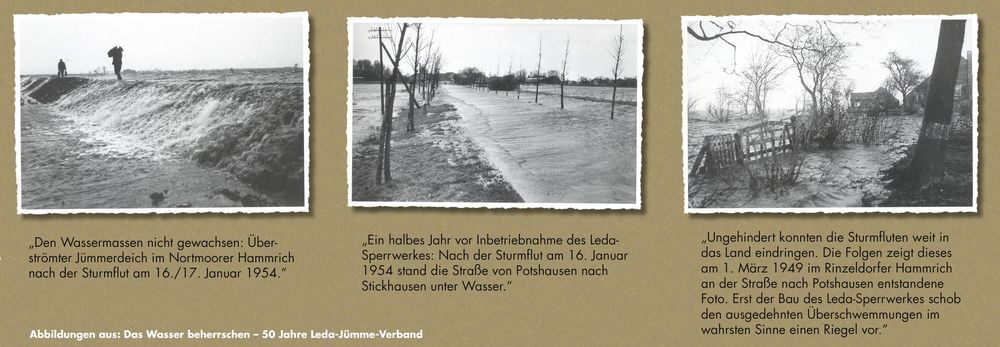 Zur Abwehr dieser Gefahren wurden im Gebiet ca. 260 km Schutzdeiche an den Flüssen und Gewässern gebaut. Um Deichbrüchen und Überflutungsgefahren bei besonders starken Hochwässern vorzubeugen, wurden mehrere von Deichen umgebene Speicherräume, die Polder, mit inzwischen rund 20 Mio. m³ Stauraum gebaut. Insgesamt sind 30 Mio. m³ Speicherraum zu schaffen.Hochwasserereignisse im Leda-Jümme-Gebiet in der Mitte des 20. Jahrhunderts