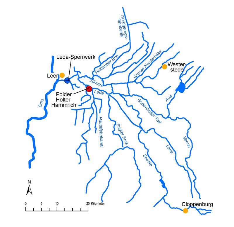 Bei starkem Wasserabfluss aus dem ca. 210.000 ha großen Einzugsgebiet der beiden Flüsse ist das niedrig gelegene Leda-Jümme-Gebiet von Überflutungen bedroht.