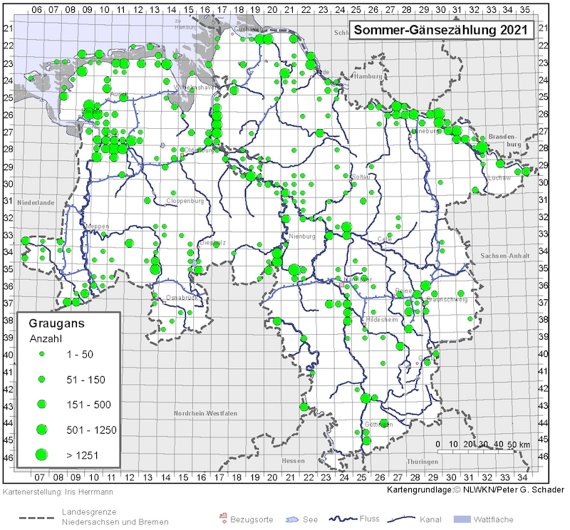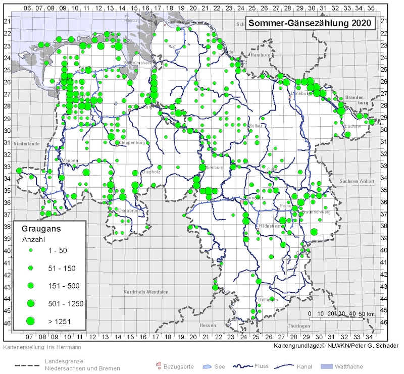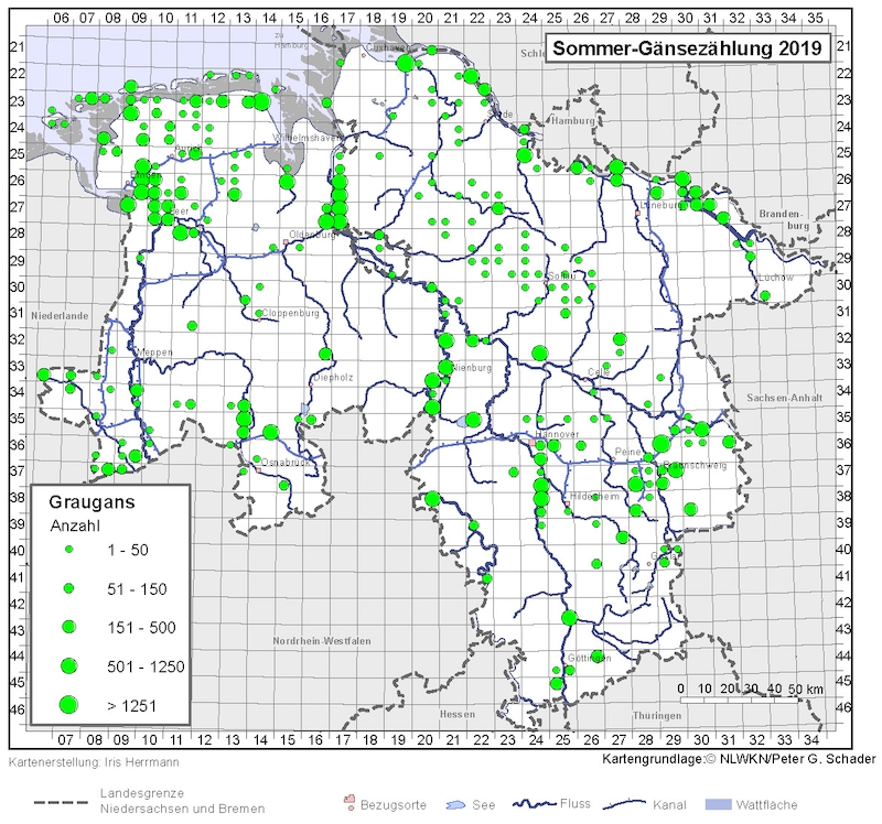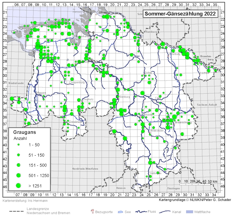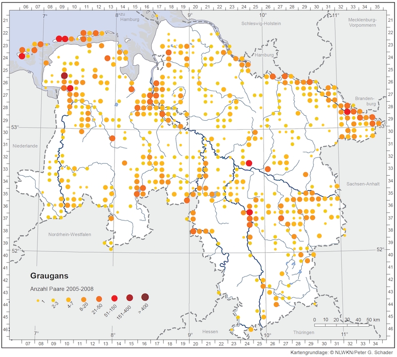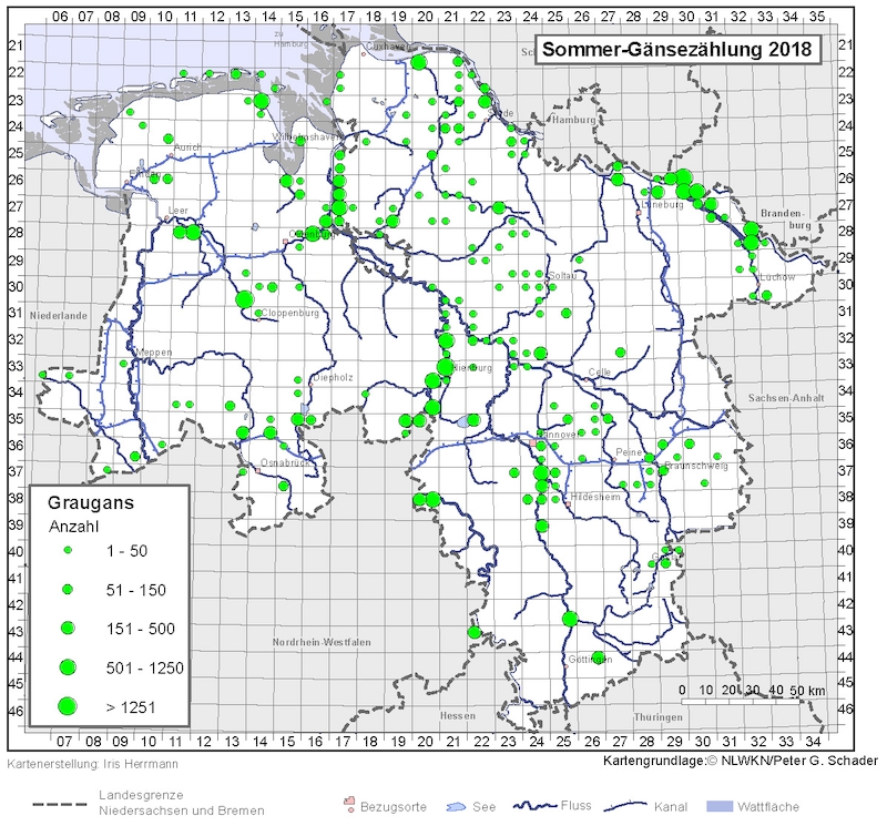 Zum Vergleich: 2016 wurden Graugansbruten aus insgesamt 654 MTB-Quadranten gemeldet und daraus ein landesweiter Bestand von 14.300-17.000 Brutpaaren ermittelt (KRUCKENBERG 2019). Die Erfassungen für den niedersächsischen Brutvogelatlas (2005-2008) basierten auf insgesamt 577 TK-Quadranten (KRÜGER et al. 2014) und ergaben seinerzeit einen landesweiten Bestand von 4.500 Brutpaaren (Mittelwert).