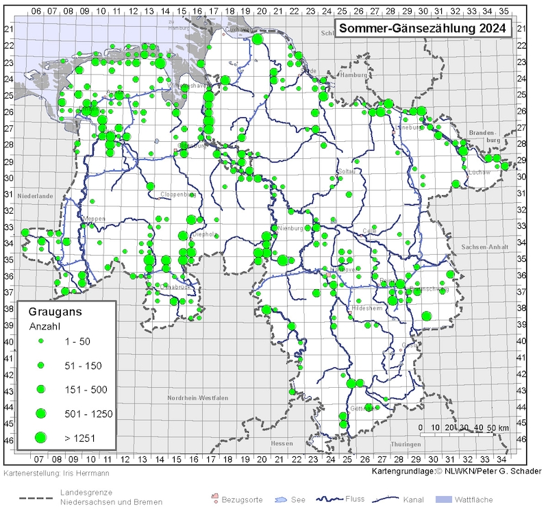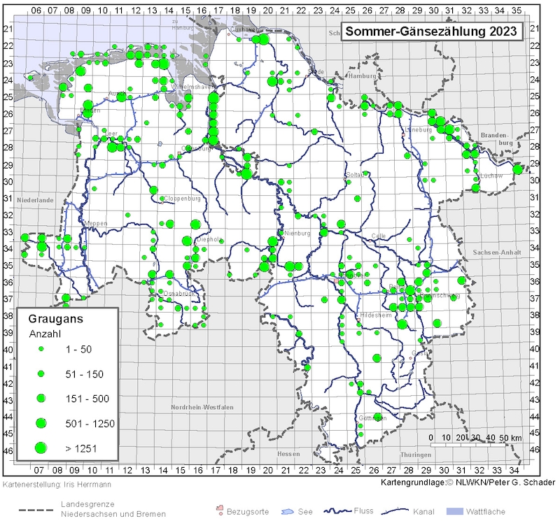 Insgesamt lassen sich die landesweiten Brutvorkommen der Graugans durch die Sommer-Gänsezählungen recht gut abbilden. Abweichende Ergebnisse, wie zum Beispiel 2018 und 2023 im Bereich der Ems, sind zum Teil auf geringere Meldeaktivitäten zurückzuführen. Zudem zeigen sich auch für den Bereich der Stader Geest an der Oste sowie der Lüneburger Heide im Einzugsbereich der Wümme regelmäßige Vorkommen.