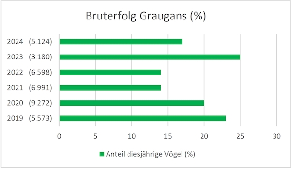Die hohe Individuenzahl der Graugänse und die umfangreiche Auswertung von Familienverbänden (bei der Auszählung von Trupps wird die Anzahl adulter Vögel der Anzahl juveniler/diesjähriger Tiere gegenübergestellt) erlauben bei dieser Art recht gute Rückschlüsse auf den saisonalen Bruterfolg. Vergleichsweise geringe Schwankungen des Jungvogelanteils deuten auf einen überwiegend konstanten Bruterfolg der Graugänse zwischen 2019 und 2024 hin. Unter diesen Voraussetzungen sind auch Rückschlüsse auf den aktuellen Brutbestand in Niedersachsen möglich.