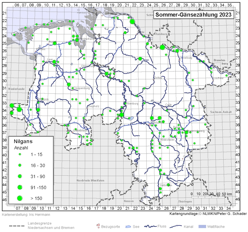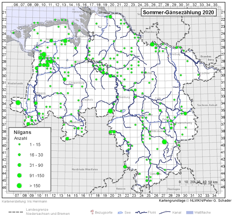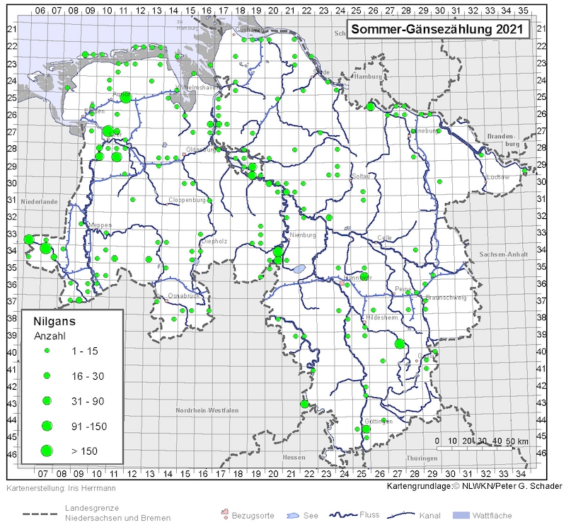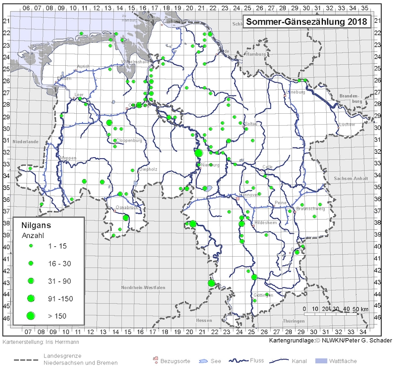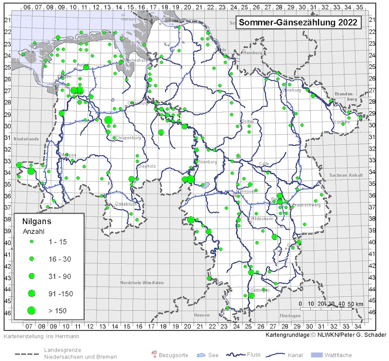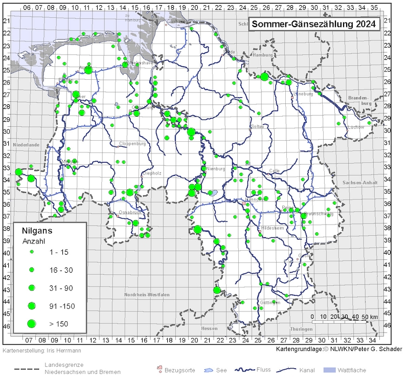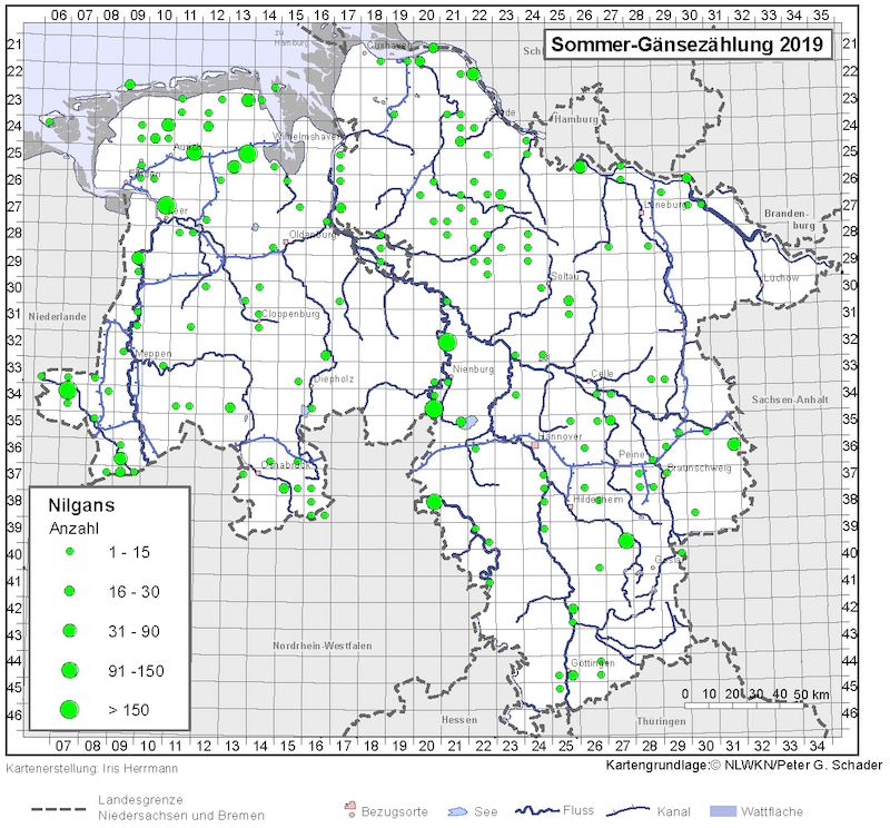 Bei der Sommer-Gänsezählung bildet sich diese klare Differenzierung, wie sie aus Brutnachweisen bekannt ist, bisher nicht ab. Hier deutet sich eine eher gleichmäßige Verbreitung innerhalb Niedersachsens an. Nilgänse mausern im Juli. Bis zum August kann es nach der Brutzeit zu größeren Ansammlungen von Familien und mausernden Nichtbrütern kommen.