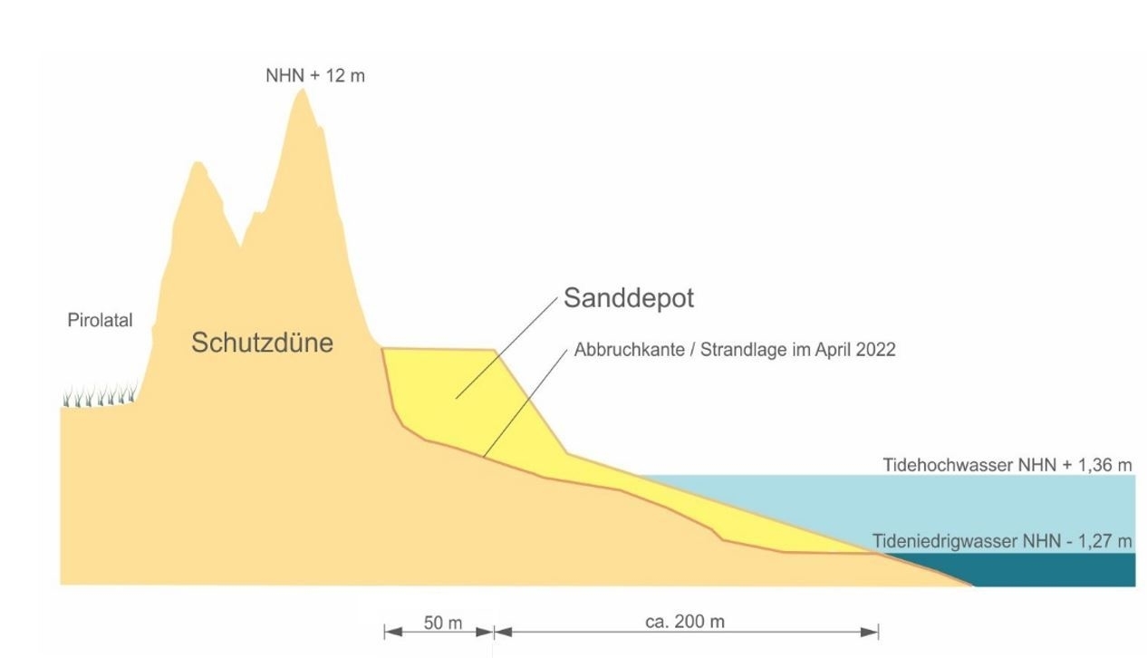 Vor allem die vorherige ereignisreiche Sturmflutsaison hatte auf einer Länge von zwei Kilometern zu erheblichen Sandverlusten am Sanddepot vor der Schutzdüne geführt. „Auf einer Teilstrecke von 700 Metern Länge wurde das Depot vollständig abgetragen“, erläutert Prof. Frank Thorenz, Leiter der für die Ostfriesischen Inseln zuständigen NLWKN-Betriebsstelle Norden. Der Sand wurde durch die starken Seegangs- und Strömungsbelastungen in den Sturmfluten dabei wie beabsichtigt nicht aus der Schutzdüne, sondern aus dem Depot abgetragen. „Das Sanddepot hat sich als Verschleißkörper gewissermaßen für die Düne „geopfert“. Damit hat es seine Funktion zum Schutz der eigentlichen Dünensubstanz am Pirolatal vollständig erfüllt“, betont Prof. Thorenz.