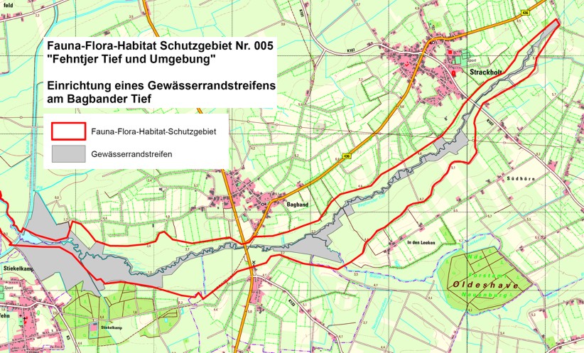 Das Bagbander Tief ist in seinem naturnahen Verlauf als typischer Geest- und Niedermoorbach bis heute erhalten geblieben. Das deshalb für Ostfriesland repräsentative und für den Naturschutz wertvolle Gewässer mitsamt seiner unmittelbar angrenzenden Aue wird jetzt durch eine geplante Renaturierung gezielt aufgewertet: Im Zuge der Flurneuordnungsverfahren Bagband und Strackholt hat das Land Niedersachsen Flächen erworben, die in einem beidseitigen Gewässerrandstreifen entlang des Bagbander Tiefs zusammen gelegt werden sollen. Die geplanten Gewässerrandstreifen sind zwischen zehn und 800 Meter breit und ziehen sich zwischen dem Sauteler Kanal und Strackholt über acht Kilometer entlang des Bagbander Tiefs. Auf diesen Flächen plant der NLWKN (Niedersächsischer Landesbetrieb für Wasserwirtschaft, Küsten und Naturschutz) verschiedene Renaturierungsprojekte.