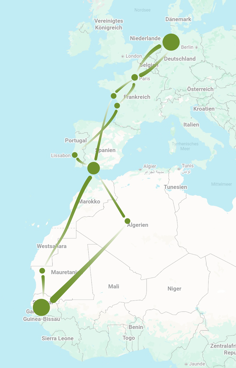 Auf dem Weg in das Überwinterungsgebiet im Senegal und in Gambia machte der Vogel einen Zwischenstopp am Tagus in Portugal, während er auf dem Rückweg direkt von der Doñana in Südspanien über die Biskaja nach Frankreich flog. Dagegen führte ihn die Zugroute auf dem Rückweg über die Sahara nach Algerien. Womöglich war Werner zunächst in einer Gruppe von Artgenossen unterwegs, die in Richtung Italien flogen. Irgendwann hat Werner dann abrupt seinen Kurs geändert und ist auf Spanien eingeschwenkt.