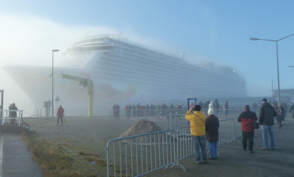Gegen 10:30 Uhr am Freitag passierte die „Norwegian Getaway“ das Emssperrwerk bei Gandersum und meisterte die Fahrt über den Fluss damit planmäßig. Zwölf Stunden zuvor – am späten Donnerstagabend gegen 22 Uhr – hatten Mitarbeiter des NLWKN (Niedersächsischer Landesbetrieb für Wasserwirtschaft, Küsten- und Naturschutz) die Tore des Emssperrwerkes geschlossen und mit dem Aufstauen des Flusses begonnen. Die eingefangene Tide und eine mehrstündige Pumpleistung des Emssperrwerkes sorgten dafür, dass das jüngste Kreuzfahrtschiff der Meyer Werft in der Nacht von Donnerstag auf Freitag in Papenburg aufbrechen konnte und nach rund neunstündiger Fahrt am Freitagvormittag seinen Liegeplatz vor dem Sperrwerk bei Gandersum erreichte. „Kurz nach 9 Uhr am Freitag haben wir gegen die erneut auflaufende Tide die Sperrwerkstore geöffnet, so dass die „Norwegian Getaway“ gegen 10:30 Uhr die Hauptschifffahrtsöffnung passieren konnte“, beschrieb Reinhard Backer vom NLWKN in Aurich die letzten Arbeitsschritte dieser Überführung. Für die Schaulustigen gab es wenig zu sehen: Es herrschte dichter Nebel. Der 324 Meter lange und fast 40 Meter breite Neubau der Meyer-Werft wird am Freitag gegen 15 Uhr in Eemshaven erwartet.