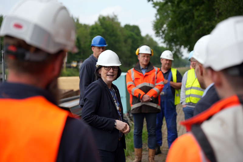 Bereits in den zurückliegenden Wochen hatte sich das Baugeschehen auf dem Kanalabschnitt zwischen Uplengen und Wiesmoor durch vorbereitende Arbeiten zur Einrichtung und Sicherung der Baustelle angekündigt. Den Knopf, der den ersten Rammschlag für den zur Einfassung der Baugrube erforderlichen Spundwandkasten auslöste, drückte NLWKN-Direktorin Anne Rickmeyer gemeinsam mit Uplengens Bürgermeister Heinz Trauernicht und Wiesmoors Bürgermeister Sven Lübbers sowie weiteren Vertretern des NLWKN am Donnerstag. Der Landesbetrieb ist für die Unterhaltung des rund 32 Kilometer langen Kanals zuständig.