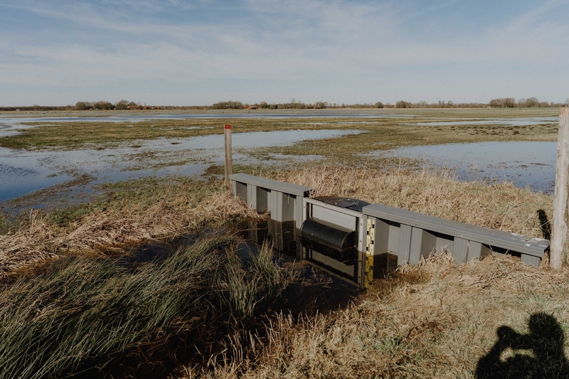 Zum Start in die neue Wiesenvogel-Brutsaison könnten die Bedingungen in der Bleckriede kaum besser sein: Die Gräben sind maximal gefüllt, und weite Teile der Wiesen und Weiden sind flach mit Wasser überstaut. Obwohl der Winter insgesamt trocken war, sind die Vorzeichen ähnlich gut wie im sehr nassen Rekordjahr 2024. Mit den neuen Stauanlagen soll das Wasser länger auf den Flächen zurückgehalten werden. Der Erfolg der Maßnahme kann gemessen werden: „Hierzu sind mehrere Wasserstands-Messpegel in der Bleckriede installiert“, berichtet Gapinski. Das Stausystem und die Messpegel wurden mit EU-Fördermitteln finanziert. „Die Messpegel sind Teil einer aktuell laufenden Machbarkeitsstudie. Deren Ergebnisse sollen helfen, das Wassermanagement zu optimieren, auch wenn Wasser in Folge des Klimawandels knapp wird.“