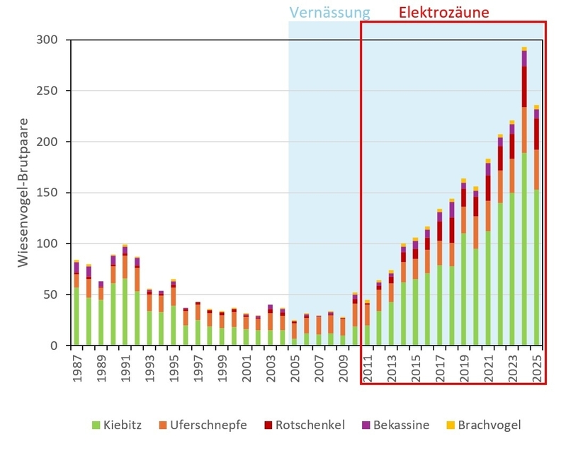 Nennenswerte Erfolge blieben aber noch aus, da Küken und Eier größtenteils Beute von Füchsen und Mardern wurden. Deshalb wurde 2011 mit der Einzäunung von Brutflächen begonnen. Spezielle, 1,40 Meter hohe Elektrozäune schließen Fressfeinde seitdem zuverlässig aus. Das so eingezäunte Grünland misst inzwischen 50 Hektar. Die Überwachung des Vogelbestands und die Wartung der Zäune übernimmt der BUND DHM, was durch die Förderung als Ökologische Station durch das Land Niedersachsen ermöglicht wird.