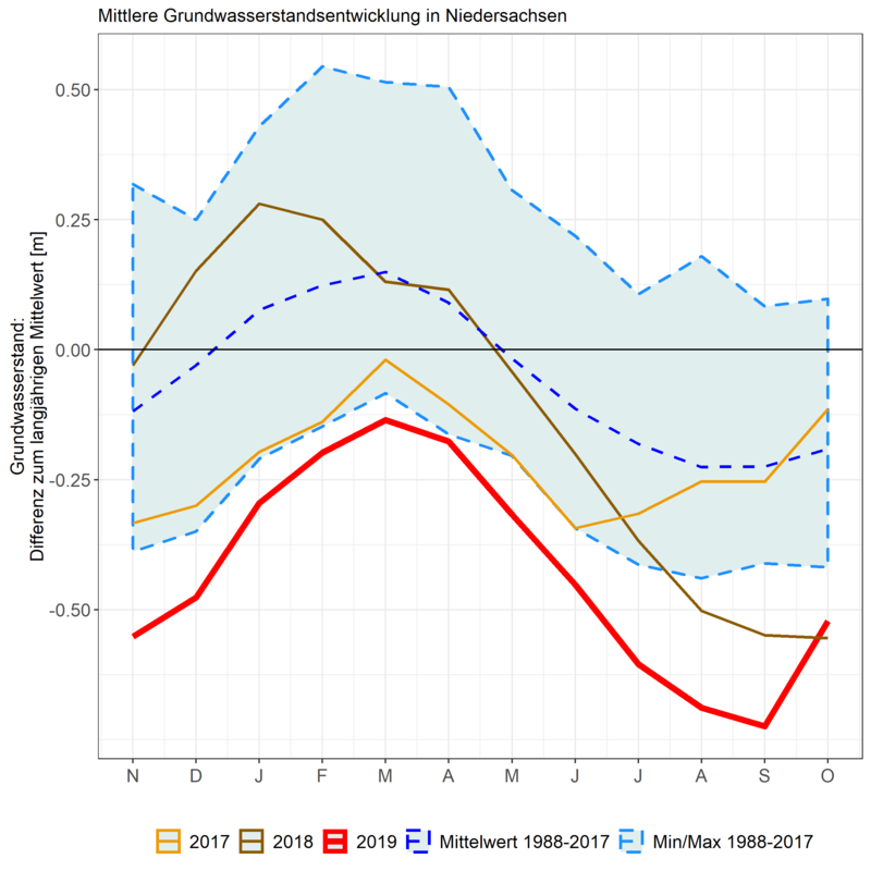 2019 lagen die Jahrestiefstände im Mittel 0,36 Meter unterhalb der mittleren Werte im Vergleichszeitraum 1988 bis 2017 (2018: 0,23 Meter). Die ungünstigsten Grundwasserstandsentwicklungen und höchsten Absenkungen waren in den Geest- und Börderegionen Niedersachsens zu beobachten. Die günstigsten Entwicklungsverläufe mit den geringsten Absenkungen fanden in den Niederungsregionen insbesondere Westniedersachsens sowie in den Marschgebieten statt.