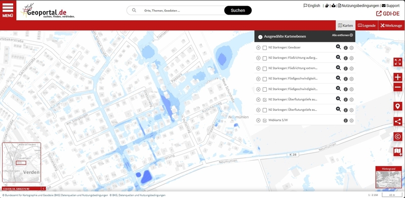 Verden. „Die Arbeiten zur Erstellung der Hinweiskarte seitens des Bundesamts für Kartographie und Geodäsie sind jetzt abgeschlossen. Am 22. November 2024 wurden die Karten über das Geoportal des Bundes veröffentlicht“, so Tobias Drückler, Experte für das Thema Starkregen im Niedersächsischen Landesbetrieb für Wasserwirtschaft, Küsten- und Naturschutz (NLWKN). Sein Fachkollege Malte Schilling ergänzt: „Dort kann sich ab sofort jeder über die mögliche Gefährdung seines Hauses, Fahrzeugparkplatzes oder Arbeitswegs informieren.“ Die Karten sind unter folgender Webadresse zu finden: Geoportal.de
