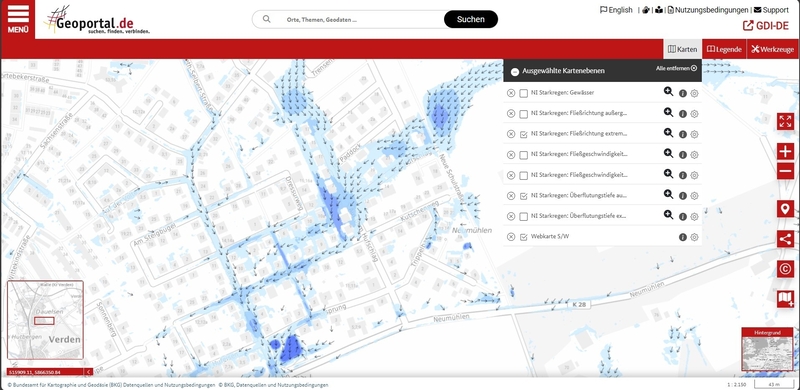 Wir empfehlen, zunächst alle Kartenebenen auszuschalten und nur die „NI Starkregen: Überflutungstiefe au…“ und „Webkarte S/W“ zu aktivieren. Dort kann sich jeder die Region suchen, die von Interesse ist. Um zu verstehen, woher das Wasser kommt, kann zusätzlich die Kartenebene „NI Starkregen: Fließrichtung au…“ angeklickt werden, die Fließpfeile zeigen die Strömungsrichtung des Wassers. Für eine erste Hilfestellung gibt es im Menü ein Tutorial.