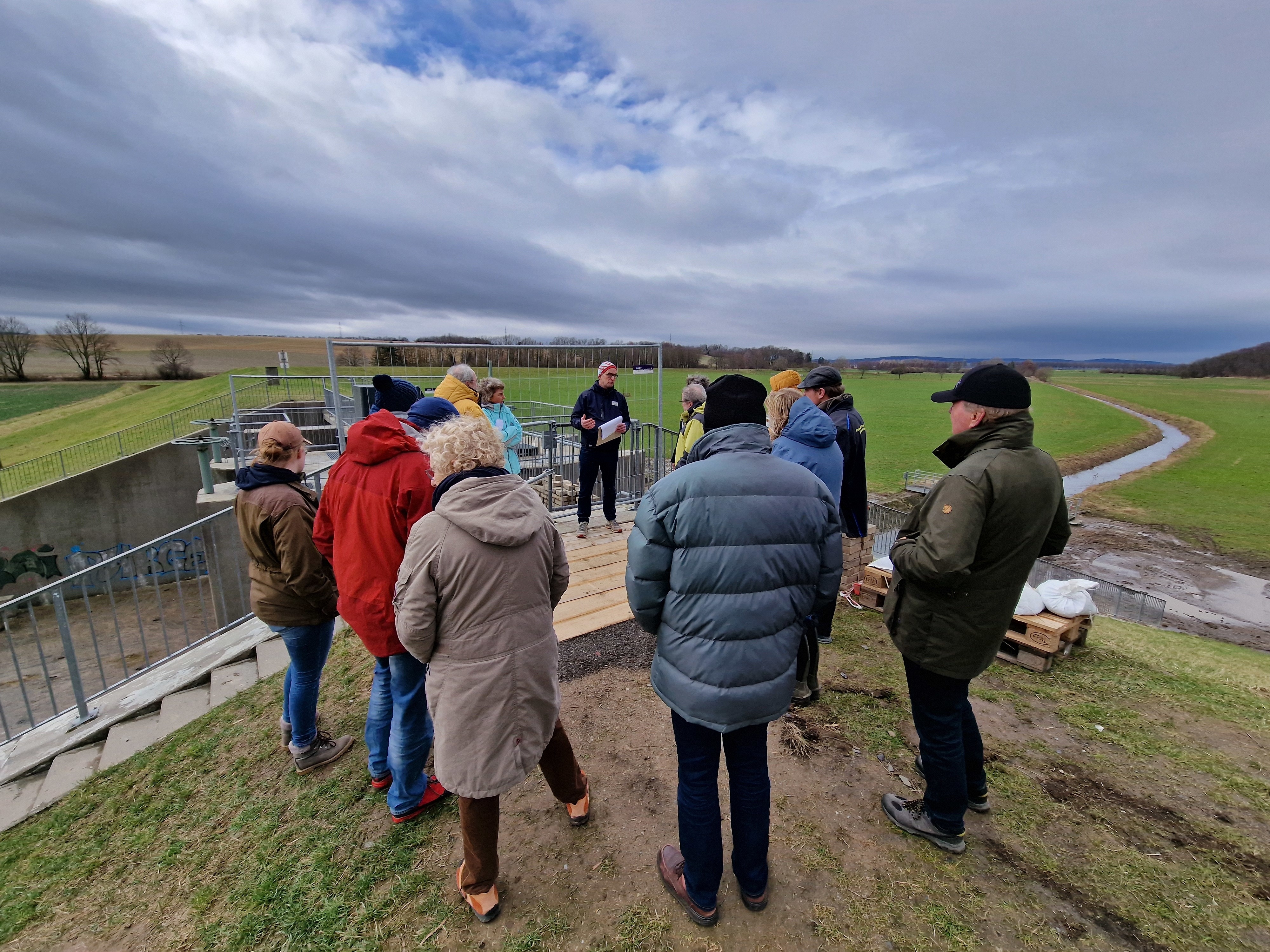 Insgesamt zwölf Personen, darunter Vertreterinnen und Vertreter ortsansässiger Vereine und Gemeinden sowie private Bürgerinnen und Bürger, nutzten die Gelegenheit, um sich mit Michel Radon vom NLWKN auszutauschen. „Wir wissen, dass es vor Ort ein großes Interesse am Hochwasserrückhaltebecken und auch Bedenken gibt, wenn sich das Abschlussbauwerk wie jetzt im Umbau befindet. Deshalb war dieser Austausch sehr wichtig, um Fragen zu klären und Bedenken auszuräumen. Das Gespräch verlief in einer sehr angenehmen Atmosphäre“, erklärt Radon. Er ist Geschäftsbereichsleiter Betrieb und Unterhaltung in der NLWKN-Betriebsstelle Süd, die für das Hochwasserrückhaltebecken Klein Mahner zuständig ist