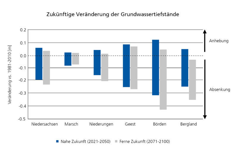 Die jetzigen Ergebnisse zeigen, dass es allein durch die Auswirkungen des Klimawandels in Niedersachsen regional zu längeren Phasen mit niedrigen Grundwasserständen im Sommer und im Herbst sowie zum Teil höheren Grundwasserständen im Winter und im Frühjahr kommen kann. Dies birgt auch ein zunehmendes Risiko für mehrjährige Zeiträume mit entsprechenden Verhältnissen, wie wir sie zum Beispiel aktuell seit 2018 als Trockenphase mit insgesamt unterdurchschnittlichen Niederschlägen erleben. Gleichzeitig können diese niedrigen beziehungsweise hohen Wasserstände auch deutlicher ausfallen, im Einzelfall mit einer Abweichung von bis zu einem halben Meter gegenüber den langjährigen mittleren Verhältnissen. „Und diese Veränderungen werden alleine durch die zukünftigen klimatischen Verhältnisse hervorgerufen“, betont Petry. „Menschliche Einflüsse auf die Grundwasserstände, beispielsweise ein erhöhter Bedarf an Wasserentnahmen für die Trinkwasserversorgung oder die landwirtschaftliche Feldberegnung, können diese Veränderungen noch verstärken. Dieser Effekt wurde aber bei unseren Modellierungen noch gar nicht berücksichtigt.“ Größere Veränderungen sind in Niedersachsen vor allem in der fernen Zukunft, das heißt am Ende des Jahrhunderts zu erwarten, regional treten diese aber zum Teil bereits in der nahen Zukunft, also etwa bis zur Mitte des Jahrhunderts in Erscheinung.