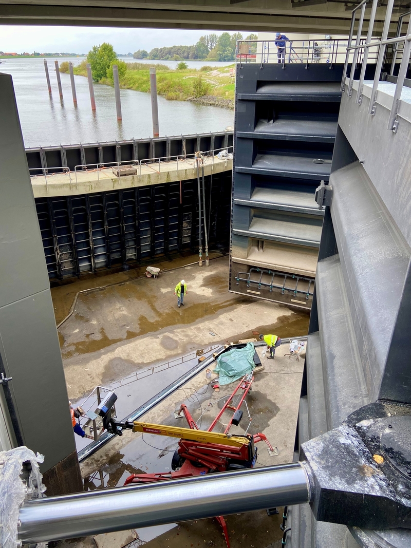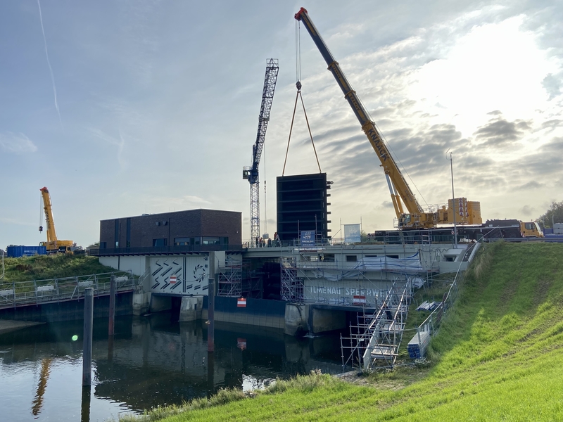 Der Startschuss für die umfangreichen Instandsetzungsarbeiten in Hoopte war Mitte August 2020 gefallen: Während des ersten Bauabschnitts stand vor allem der Bau eines neuen Betriebsgebäudes im Fokus. Im Rahmen des zweiten Bauabschnitts konnte Anfang November 2021 dann die Instandsetzung und Verstärkung der vier Hubtore in den beiden seitlichen Flutöffnungen des Sperrwerks erfolgreich abgeschlossen werden. In 2022 folgte als weiterer wesentlicher Baufortschritt der Einbau der neuen elbseitigen Stemmtore. Im Verlauf dieses Sommerhalbjahres konnte der NLWKN nun die neuen ilmenauseitigen Stemmtore in der Schifffahrtsöffnung einbauen, die das Bauwerk als zweite Deichsicherheit zur Elbe hin abschließen.