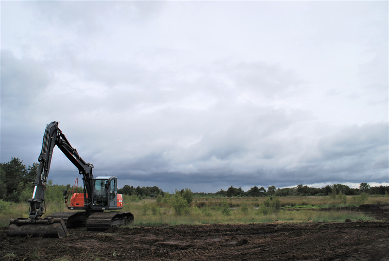 „Da das Moor auf der Projektfläche im Winter viel Wasser aufgenommen hat und dadurch nicht mehr befahrbar war, mussten wir die Restarbeiten auf die Zeit nach der Brut- und Setzzeit verlegen“, so Dorothee Wibbing von der Ökologischen Station Naturschutzring Dümmer e.V., die die Bauleitung vor Ort übernimmt. Jetzt werden noch restliche Schlitzgräben verfüllt und Dämme im Osten und Norden der Projektfläche gebaut bzw. erhöht, um dort das Niederschlagswasser einzubehalten.