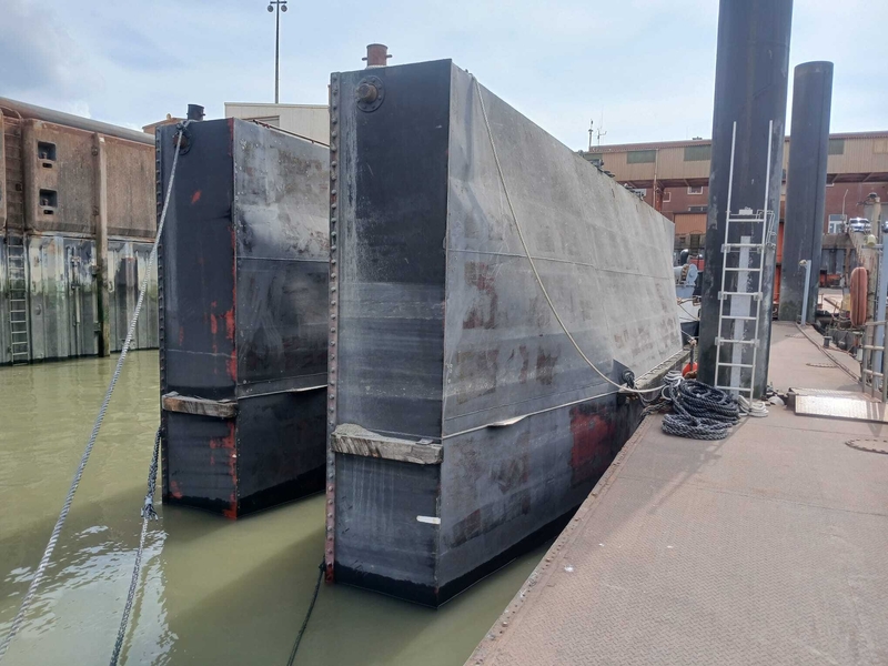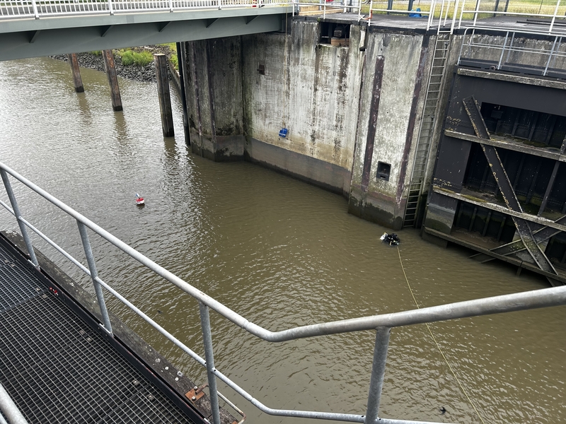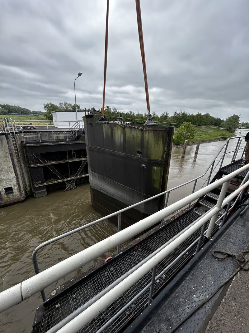 Nach dem Einsetzen pumpt der Landesbetrieb den dazwischen liegenden Sperrwerksbereich leer und kann danach mit der Reinigung und Inspektion des Bauwerkes beginnen.