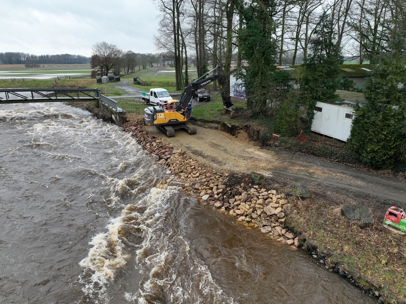 Aufgrund der Hochwasserlage der vergangenen Wochen hatte sich im linksseitigen Prallhang der Sohlengleite eine größere Auskolkung im Bereich des Geh- und Unterhaltungsweges gebildet. Der NLWKN war seit vergangenem Donnerstag an der zuvor bereits gesperrten Schadensstelle vor Ort und hatte umgehend mehrere Sicherungsmaßnahmen eingeleitet. Vor Ort wurden mit einem Kettenbagger Wasserbausteine an der Auskolkung eingesetzt. Hierzu wurde temporär die Abgabemenge aus dem Hochwasserrückhaltebecken Alfhausen-Rieste gedrosselt und ein Teil davon über die Wrau umgeleitet, um die Belastung auf die Uferböschung zu reduzieren und die Arbeiten an der Schadensstelle vor Ort zu ermöglichen.