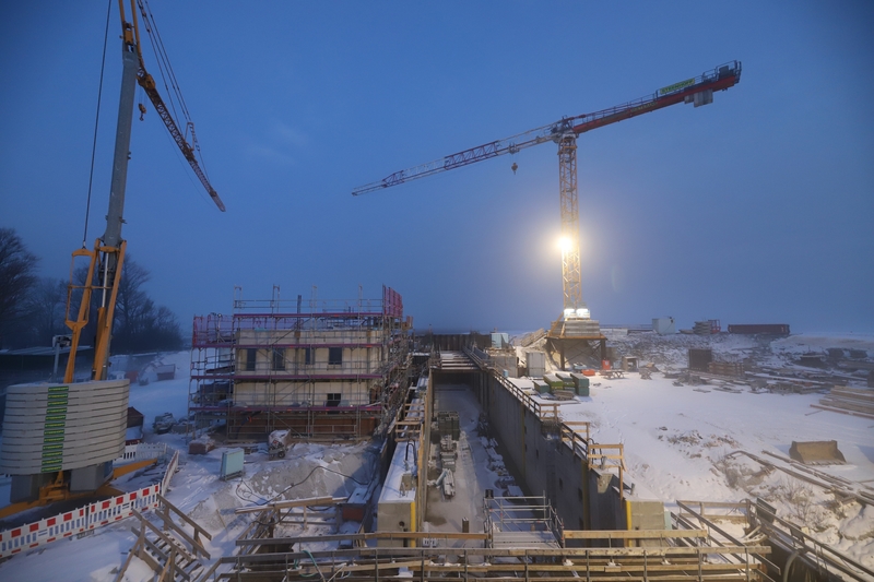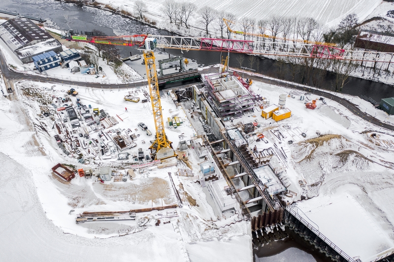 Der nächste Wandabschnitt auf der Westseite der Schleuse und die Obergeschossdecke des neuen Betriebsgebäudes sind schon für die Betonage vorbereitet. Sobald es die Wetterlage zulässt, sollen die Arbeiten hier weitergehen. „Auf den Terminplan hat diese Unterbrechung zunächst keinen Einfluss. Ein kurzzeitiger witterungsbedingter Stopp der Arbeiten ist gerade im Winter nicht ungewöhnlich. Die letzten Jahre hatten wir vielmehr Glück, dass wir weitgehend eisfrei durcharbeiten konnten“, berichtet Andreas Kosch, Projektleiter beim Niedersächsischen Landesbetrieb für Wasserwirtschaft, Küsten- und Naturschutz (NLWKN).