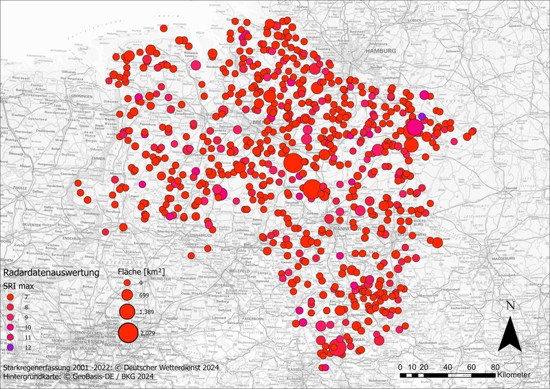 Eine Auswertung des Deutschen Wetterdiensts für den Zeitraum von 2001 bis 2022 hat alleine für Niedersachsen mehr als 700 Niederschlagsereignisse mit einem maximalen Starkregenindex (SRI) ab Stufe 7 („außergewöhnlicher Starkregen“) ergeben. Der Starkregenindex (SRI) ist ein Wert, den die Intensität eines Niederschlagsereignisses beschreibt. Eines der letzten Starkregenereignisse trat mit ungefähr 60 bis 70 Millimetern - das entspricht etwa sechs bis sieben Wassereimern pro Quadratmeter - am 13. August 2024 von 17 bis 18 Uhr in Aurich mit einem SRI 9 („extremer Starkregen“) auf. Dieses Ereignis führte zu einer Teilevakuierung in einem Alten- und Pflegeheim. Auch das Klinikum war betroffen, aber Feuerwehr und Technisches Hilfswerk konnten eine Evakuierung verhindern. Insgesamt wurden für dieses Ereignis 180 Einsätze in Aurich registriert.