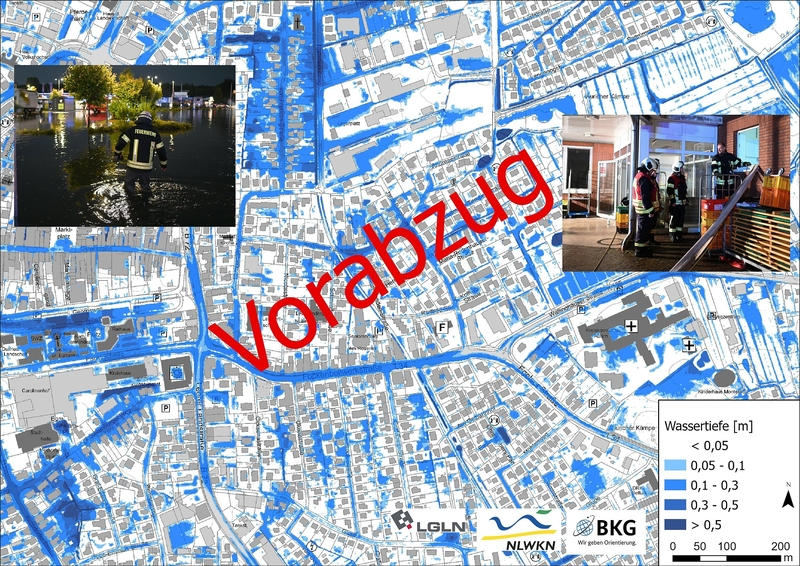 Die deutschlandweite Hinweiskarte wird die maximalen Wassertiefen und Fließgeschwindigkeiten von einem außergewöhnlichen (SRI 7) sowie extremen Starkregenereignis (SRI 9) darstellen. Anhand der Hinweiskarten kann jede und jeder erkennen, welche Regionen bei einem SRI 7 betroffen sind. Die Karte ist so genau, dass auch einzelne Gebäude zu erkennen sind. Ein Vorabzug für Aurich veranschaulichte die Beobachtungen vom Ereignis im August 2024 und zeigte die Betroffenheit des Alten- und Pflegeheims sowie des Klinikums und von lokalen Senken, in denen sich das Wasser sammelte und so zu überfluteten Kellern beziehungsweise Grundstücken führte.