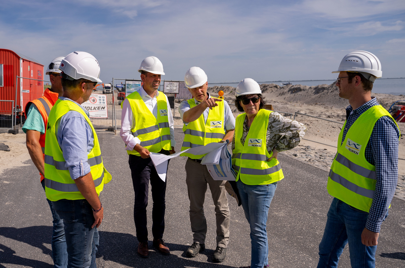 Bei einem Besuch der Baustelle zeigt dabei bereits der Blick nach Norden, wie der derzeit im Umsetzung befindliche Deichabschnitt bei Beendigung der Arbeiten im September einmal aussehen soll: Das erste 400 Meter lange Teilstück des insgesamt 800 Meter langen Schutzbauwerks konnte bereits im vergangenen Jahr erfolgreich umgesetzt werden. Und auch in der laufenden zweiten Bauphase komme man gut voran, bestätigt der Leiter der Norder Betriebsstelle des NLWKN, Prof. Frank Thorenz: „Seit April konnten wir bereits ein Viertel der neuen Uferschutzkonstruktion herstellen. Auf der gesamten Länge des Vorhabens wurden zudem bereits 800 Meter Spundwand an der See- und Landseite der Konstruktion eingebracht. Sie dient vor allem dem Schutz gegen Unterspülung“, so der Küstenschutzexperte am Rande einer Begehung der Baustelle mit dem Niedersächsischen Umweltminister Olaf Lies und NLWKN-Direktorin Anne Rickmeyer in dieser Woche.
