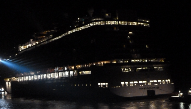 Nächtliche Übefürhrung: Die "Norwegian Escape" kurz vor dem Emssperrwerk (19. September 2015)
