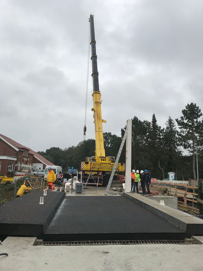 Osterhausen/ Aurich – Nach einer mehrwöchigen Unterbrechung gehen die Arbeiten an der Brücke in Osterhausen nun wieder sichtbar voran: Am Donnerstag wurde die Brückenplatte aus Stahl aufgelegt, die Montage der Pylone und das Einhängen des Waagebalkens folgen direkt danach. „Voraussetzung für das Auflegen der Brückenplatte war, dass wir alle Massivbauarbeiten wie das Herstellen der Betonkappen oder das Aufstellen des Leitwerks zuvor erledigen konnten“, erklärte Klaus Kiesling, der die Baumaßnahme seitens des NLWKN (Niedersächsischer Landesbetrieb für Wasserwirtschaft, Küsten- und Naturschutz) leitet.