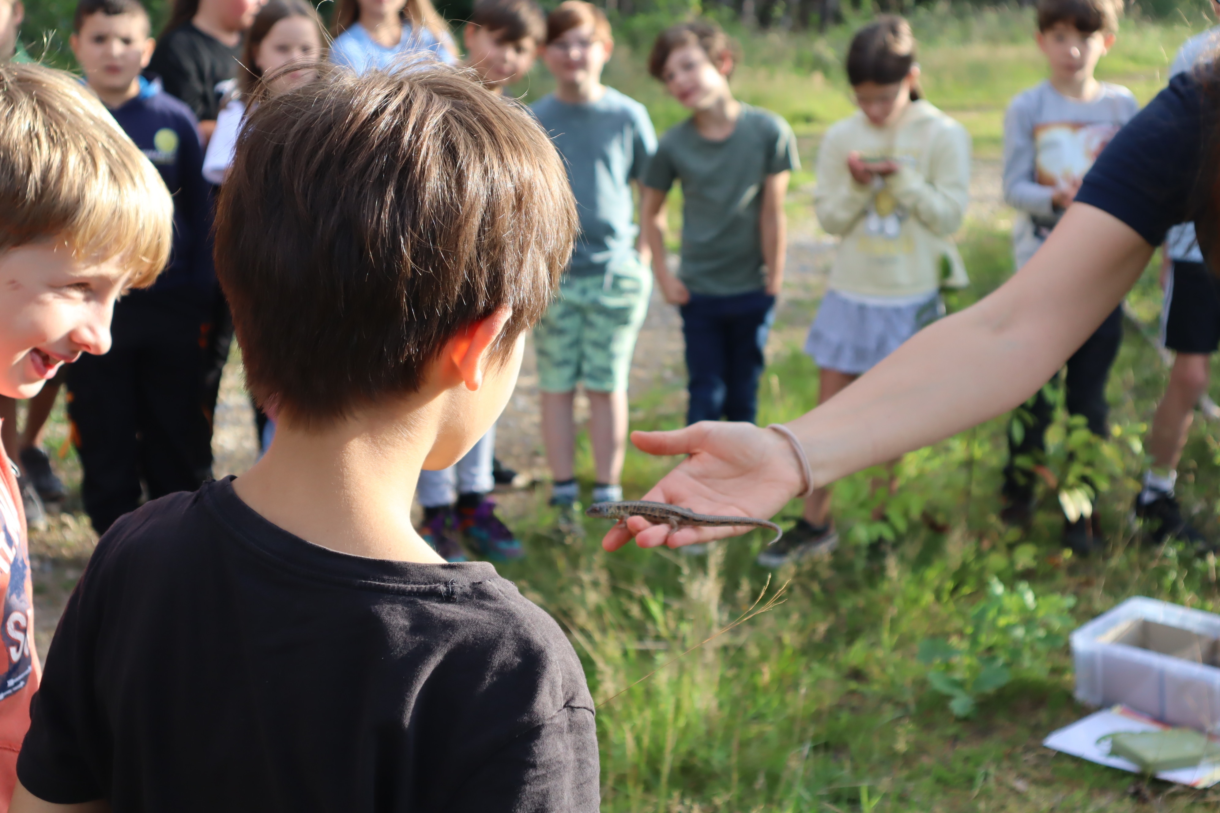 „Die immer seltener werdende Zauneidechse lebt vor allem an lichten Waldrändern oder wie hier, an einem kleinen Hang einer Grube, wo früher Sand abgebaut wurde“, erklärte Leonie Braasch, Projektmitarbeiterin beim NWLKN, den Kindern. „Dieser Lebensraum würde ohne menschliche Hilfe jedoch schnell zuwachsen. Dann könnten Zauneidechsen hier nicht mehr leben. Problematisch ist hier vor allem die massive Ausbreitung der nicht heimischen, aus Nordamerika stammenden Traubenkirsche. Deshalb kommen teilweise Maschinen oder auch händische Arbeiten zum Einsatz, um die jungen Gehölzen in diesen Randbereichen zu entfernen, bevor sie groß gewachsen sind.“