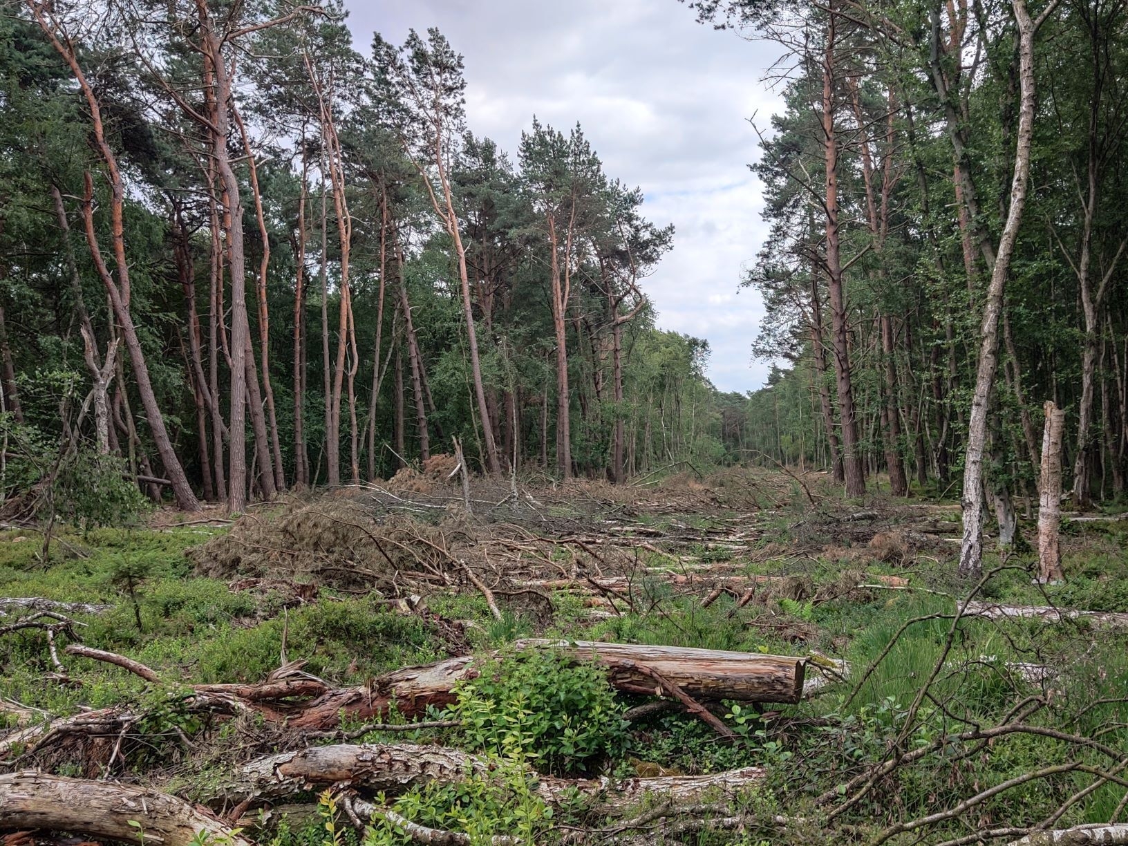 Bild 1: Bevorstehender Dammbau im Helstorfer Moor: Nach Entfernung des Holzes werden Verwallungen aus Torfboden aufgebaut, die das Regenwasser im Moor zurückhalten. (Foto: Jens Fahning, NLWKN)