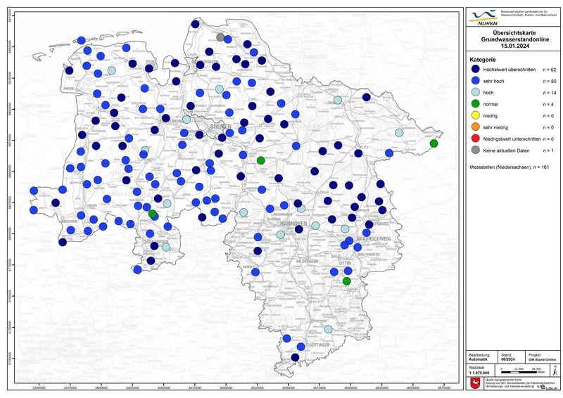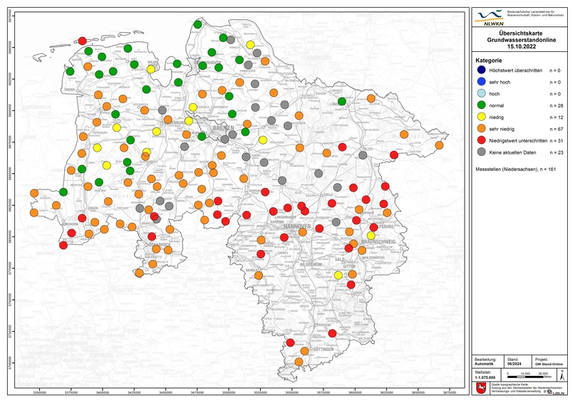 Von einer generellen Entwarnung oder Erholung der Grundwasserstände zu sprechen, hält der Niedersächsische Landesbetrieb für Wasserwirtschaft, Küsten- und Naturschutz (NLWKN) dennoch für unangebracht. Eine positive Entwicklung 2023 konnte nicht an allen Standorten festgestellt werden. In verschiedenen Geeststandorten, insbesondere in der Lüneburger Geest, fand der Landesbetrieb auch 2023 weiträumige Grundwasserstandsabsenkungen. Wie sich die Winterniederschläge 2023/2024 ausgewirkt haben, kann der NLWKN noch nicht abschließend bewerten, da die Grundwasseranstiege regional unterschiedlich deutlich ausfielen und aufgrund der zeitlichen Verzögerung an vielen Standorten im Frühjahr 2024 auch noch andauerten.