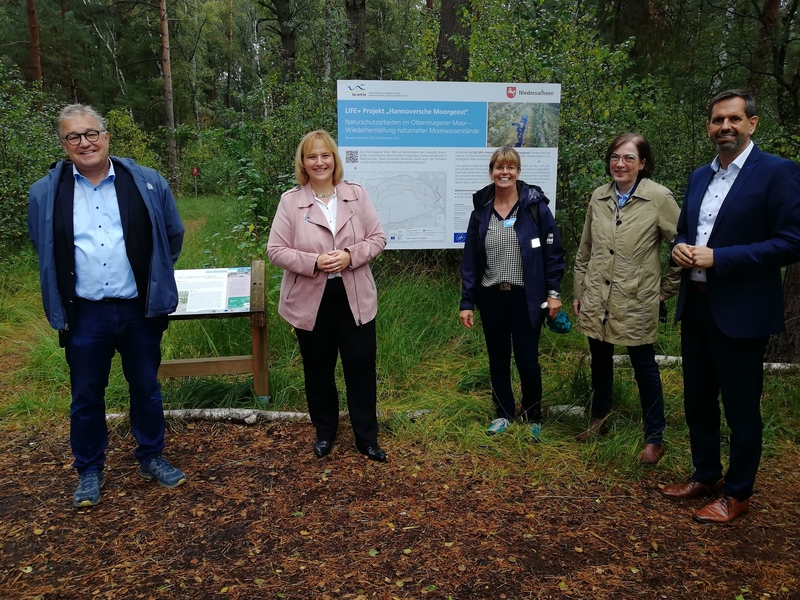 Hannover/Resse – Hoher Besuch in der Hannoverschen Moorgeest: Olaf Lies, der niedersächsische Umweltminister, informiert sich zum Baubeginn des EU LIFE-Projekts im Otternhagener Moor. Eingeladen hat der Projektträger, der Niedersächsische Landesbetrieb für Wasserwirtschaft, Küsten- und Naturschutz (NLWKN). Der Landesbetrieb setzt das Projekt im Auftrag des niedersächsischen Umweltministeriums mit der Region Hannover um. Der Umweltminister macht sich vor Ort ein Bild von den Renaturierungsarbeiten. „Intakte Moore sind aktive Ökosysteme. Sie sind ein Gewinn für den Naturschutz, den Wasser- und Nährstoffhaushalt und das Klima“, sagt Umweltminister Lies. „Der Erhaltungszustand unserer letzten verbliebenen Hochmoore ist jedoch überwiegend schlecht. Deshalb drängt die Zeit – wir müssen handeln. Mit diesem großen Leuchtturmprojekt steuern wir aktiv gegen den Trend.“