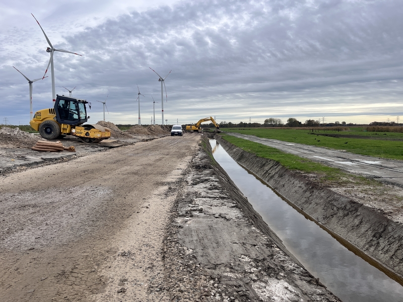 Die Spundwandarbeiten entlang des nördlichen Damms zwischen Dykhausen und der Autobahnbrücke A 29 sind bereits abgeschlossen. Noch bis Ende November stehen nun letzte Erdarbeiten am Damm im Fokus. „Wenn die Witterung mitspielt, können im Dezember die Betonspurbahnen des neuen Unterhaltungsweges hergestellt werden“, erklärt Lara Edzards, Bauingenieurin des NLWKN in Aurich. Anschließend sind noch weitere Restarbeiten wie das Anfüllen des Seitenbereichs des Unterhaltungsweges und kleinere Pflasterarbeiten erforderlich. Die Fertigstellung der Arbeiten auf der Nordseite ist für Ende Dezember geplant. „Insgesamt befindet sich das Projekt auf einem guten Weg“, freut sich Edzards.