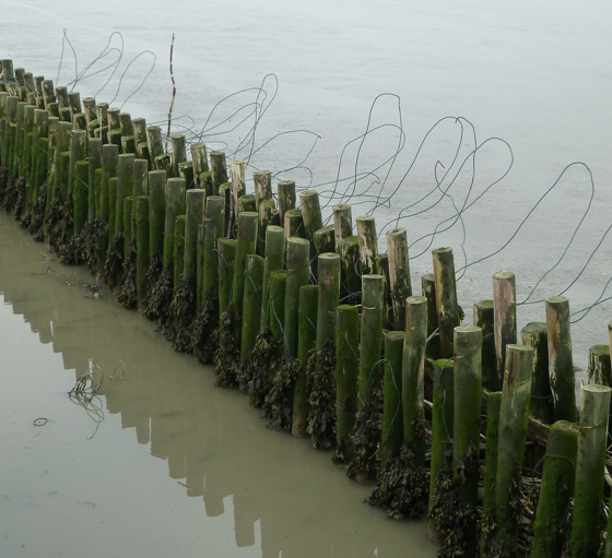 Das Prinzip ist einfach und funktioniert seit jeher: Die Lahnungsfelder beruhigen die Strömung und fördern so die Sedimentation, also die Aufschlickung. Das mit der Flut eingeströmte Wasser kommt in den Lahnungsfeldern, die etwa 100 x 200 Meter groß sind, zum Stillstand, so dass sich die im Wasser enthaltenen Schwebstoffe absetzen können. Und sobald ein Lahnungsfeld ausreichend aufgeschlickt ist, siedeln sich dort die ersten Pflanzen an.