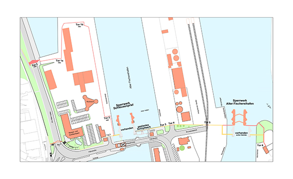 Das neue Sperrwerk liegt seeseitig ca. vier Meter vor dem vorhandenen Sperrwerk im Hafenbecken "Alter Fischereihafen", und es hat keine Verbindung zum vorhandenen Sperrwerk.