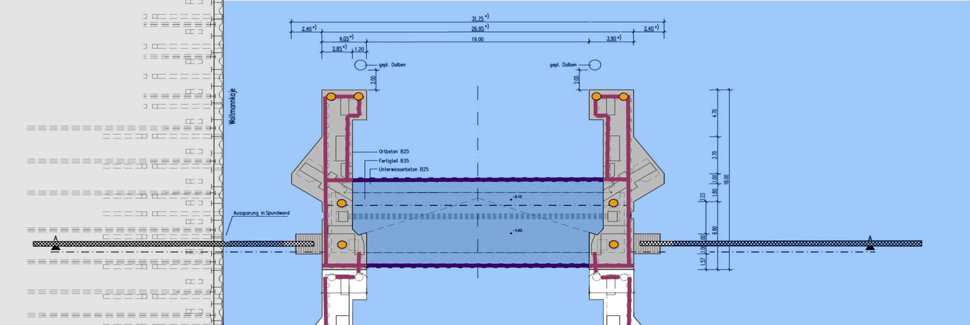 mit Schwimmkranhilfe auf vier Pfählen abgesetzt. Die Ortbetonwände liegen sowohl auf den Seitenwänden des Fertigteiles als auch auf einer Tiefgründung aus Spundwänden und Lotpfählen.