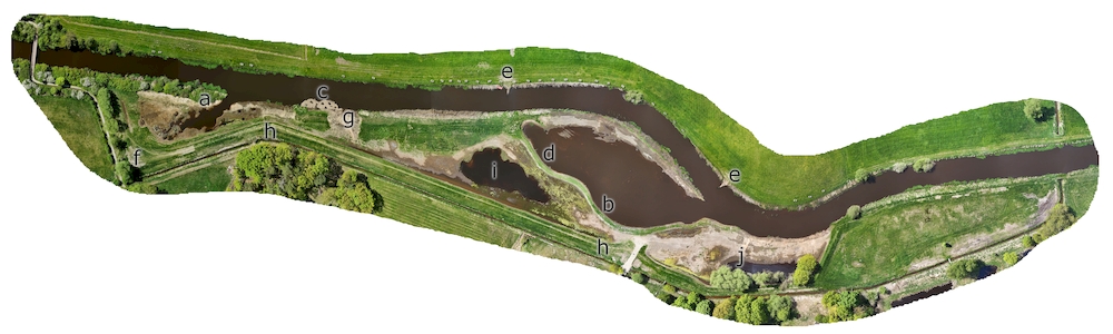 Mit einer Gewässerabschnittslänge von etwa 800 Metern und einer Fläche von rund 5,6 Hektar schließt dieses Projekt direkt an einen bereits 2018 renaturierten, unmittelbar oberstrom gelegenen Abschnitt der Aller an. Um sich dem naturnahen Zustand wieder anzunähern, wurden ein Altarm (a) und ein Nebenarm (b) angelegt, um die natürliche Gewässerentwicklung zu fördern und Lebensräume für verschiedene Fischarten zu schaffen. Durch den Einbau von Kies (c), Baumstubben (d) und Stammbuhnen als Strömungslenker (e) wird die Strömungsvielfalt erhöht und die Fließgewässerstruktur verbessert. Ein Aussichtshügel (f) ermöglicht zudem einen Einblick in das Gebiet und informiert auf einer Infotafel über die Maßnahme.