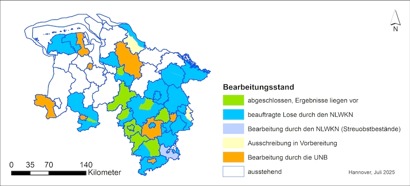 Für die Landkreise Hameln-Pyrmont, Holzminden, Peine und Verden sowie die Stadt Hameln sind die Kartierungen bereits abgeschlossen. In weiteren 22 Landkreisen, Städten und Regionen laufen die Kartierungen derzeit. Diese werden überwiegend von beauftragten Fachbüros durchgeführt, in geringem Umfang aber auch von Mitarbeiterinnen und Mitarbeitern des NLWKN-Biotopschutz. Zur Qualitätssicherung ist eine intensive Betreuung der Büros durch den NLWKN erforderlich, was die Durchführung von Abstimmungsterminen im Gelände beinhaltet.
