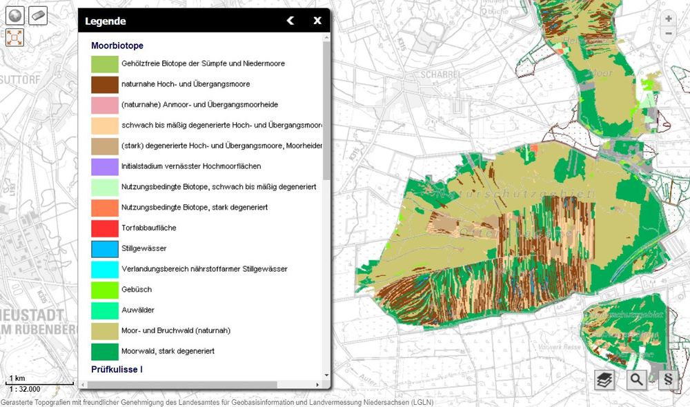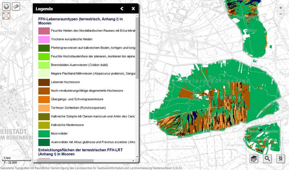 Die Karten stellen den aktuellsten Stand der dem NLWKN vorliegenden Biotopdaten in Mooren dar. Sie entstammen den Kartierungen für die Basiserfassungen der FFH-Gebiete für Niedersachsen (aktueller Stand) sowie der aktualisierten selektiven landesweiten Biotopkartierung.