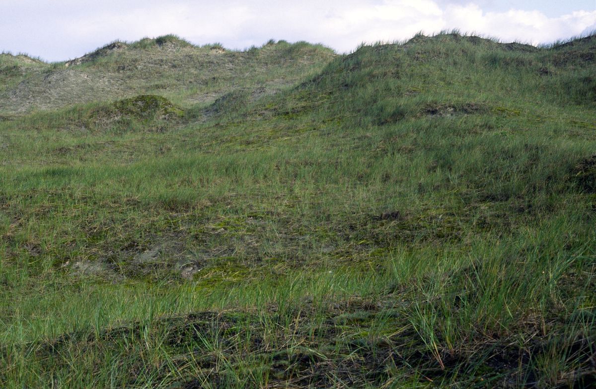 Moosreiche Graudünen mit schlechtwüchsigem Strandhafer, im Hintergrund links Übergänge zu Silbergras-Rasen; Norderney; E8.93; KDGS / KDGA) [FFH 2130]