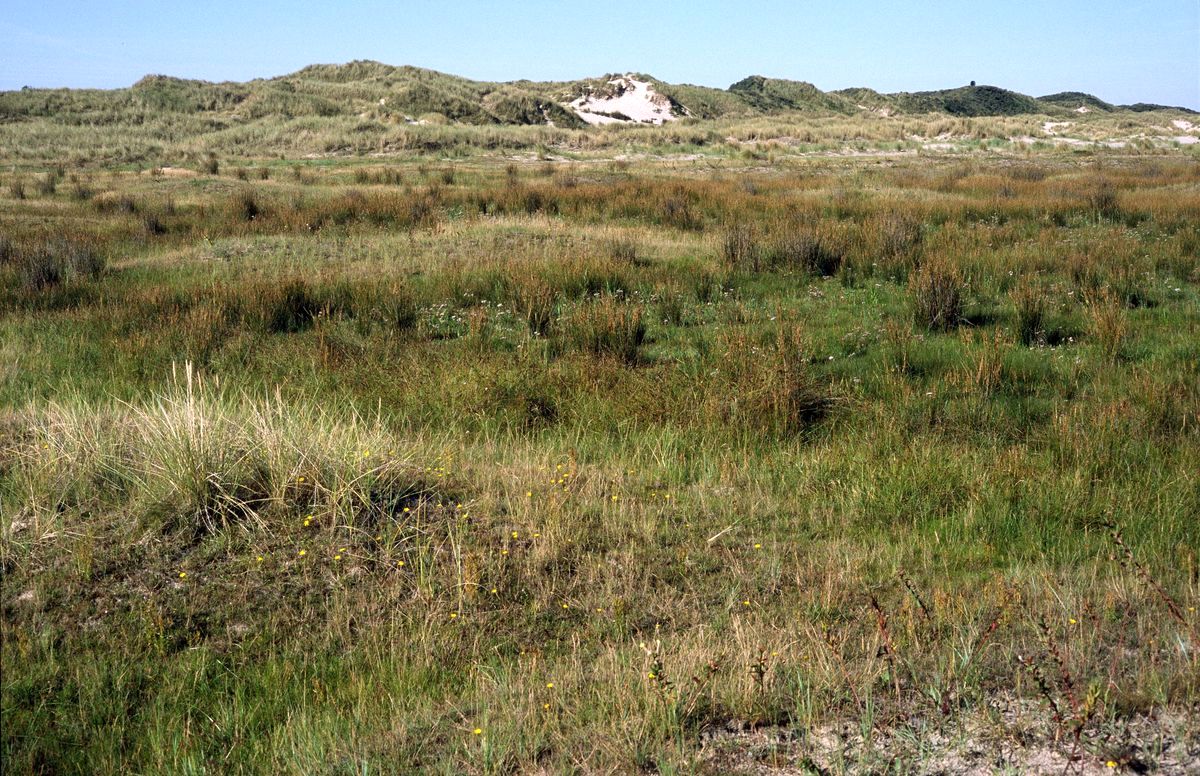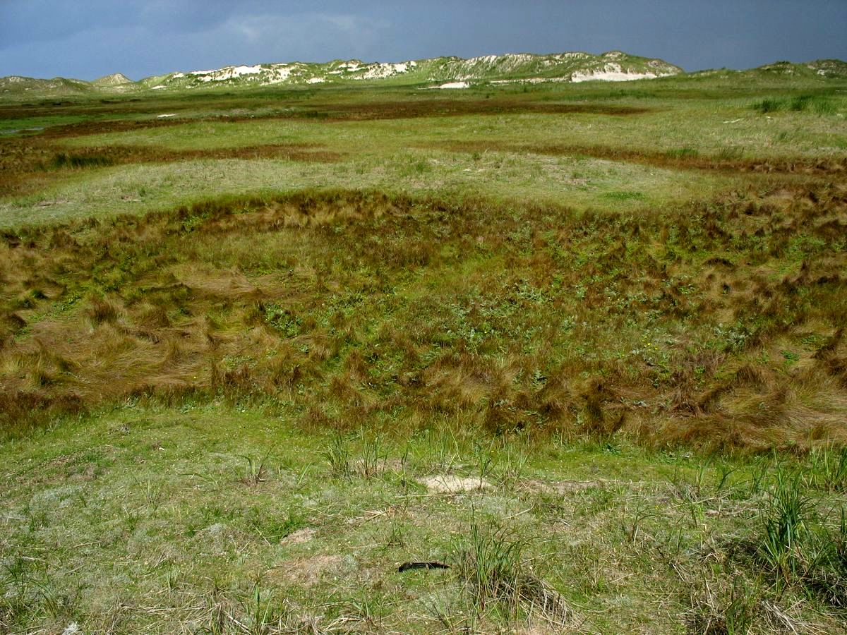 Borstgras-Rasen auf flachen, von Rindern beweideten Dünenausläufern im Komplex mit feuchten, kalkarmen Dünentälern; Randbereich der Außenweide von Borkum; M5.01; KDGB [FFH 2130] / KNA [FFH 2190]