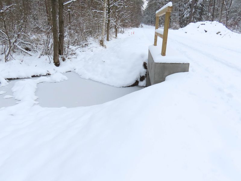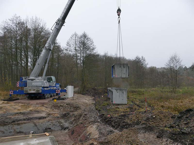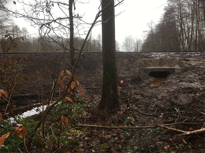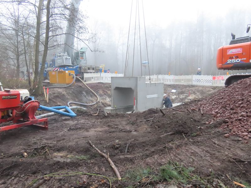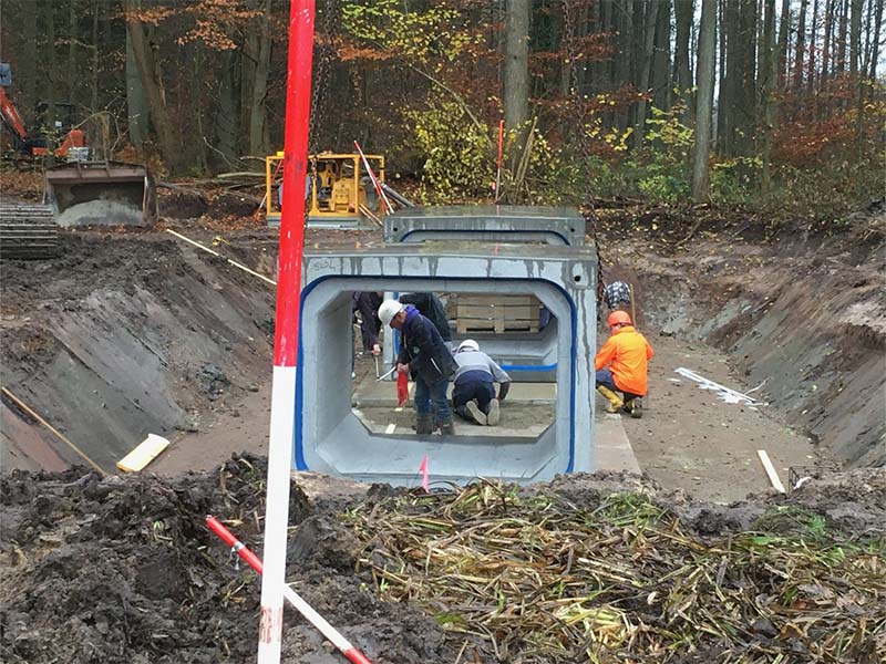 schwere Durchlassbauwerke in den Langen Damm eingebaut. Durch diese sollen der Jafelbach und der Kucksmoorgraben künftig wieder in ihren natürlichen Betten unter dem Forstweg hindurchgeführt werden.