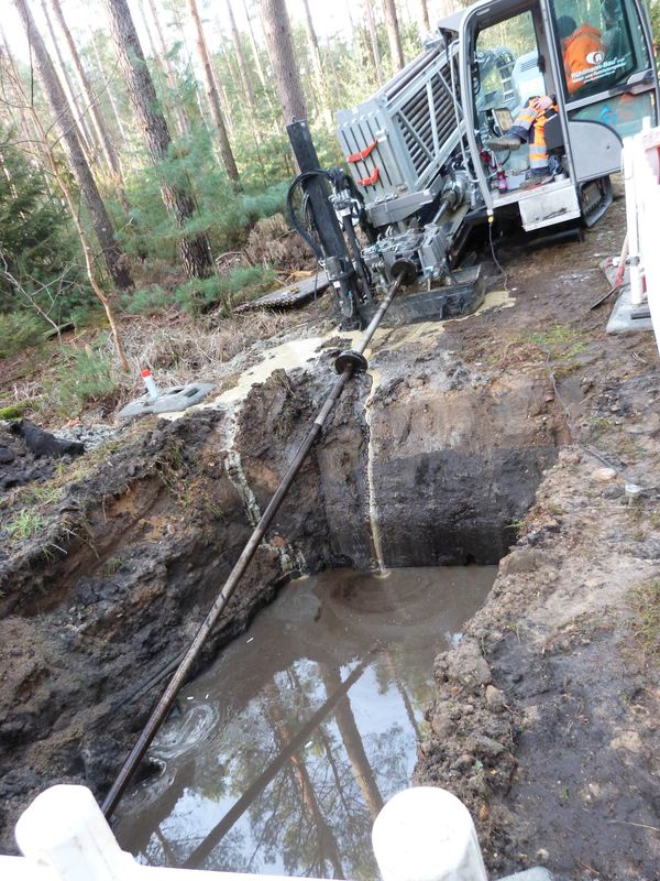 Spannend ist der Prozess, mit dem die Leitung verlegt wird: Durch eine sogenannte Spülbohrung wird zunächst ein Leerrohr von einer Baugrube zur anderen eingezogen. In diesem wird in einem zweiten Schritt die Leitung verlegt. Für die Verlegung der Leitung mit einer Länge von 120 m benötigen die Fachleute rund eine Woche.