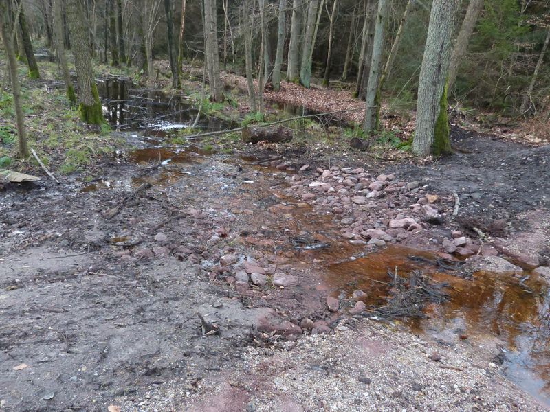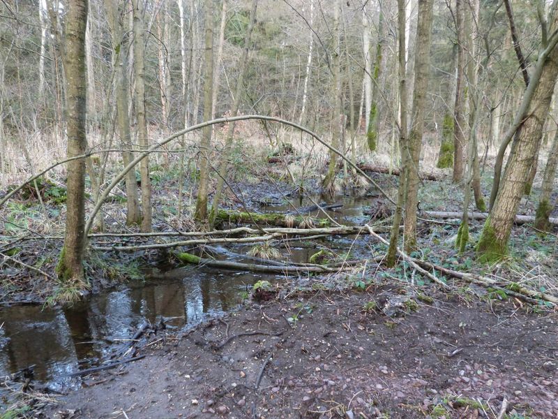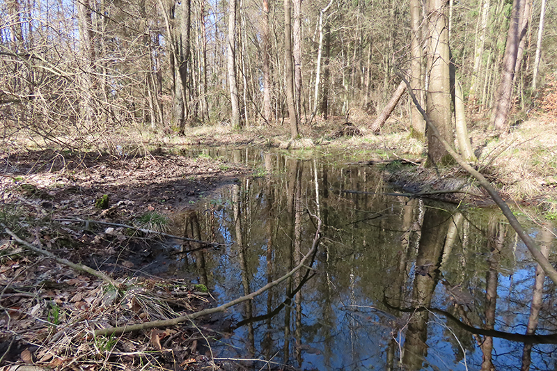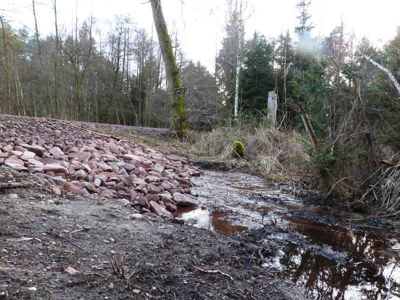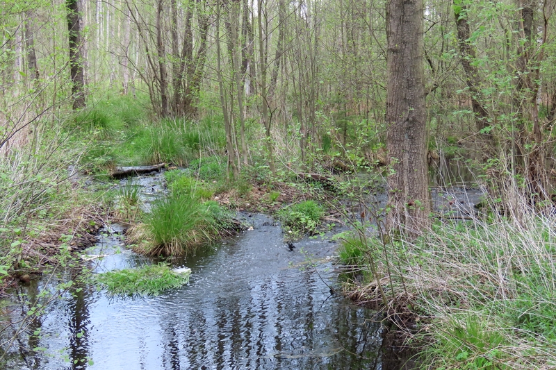 Wie wichtig der Abbau von Fließbarrieren für die Landschaft ist, zeigt sich im wasserreichen Frühjahr sehr gut an den bereits fertiggestellten Bauwerken: Während der Wald zu Beginn der Bauarbeiten noch sehr trocken war und man sich nur schwer vorstellen konnte, dass hier mal Moor war und wieder entstehen soll, verteilt sich nun Wasser in der Fläche und fließt durch die neuen Bauwerke langsam von Ost nach West.