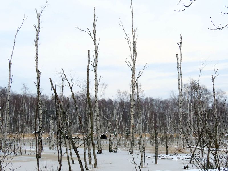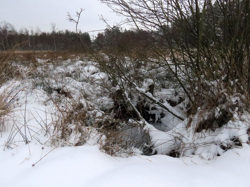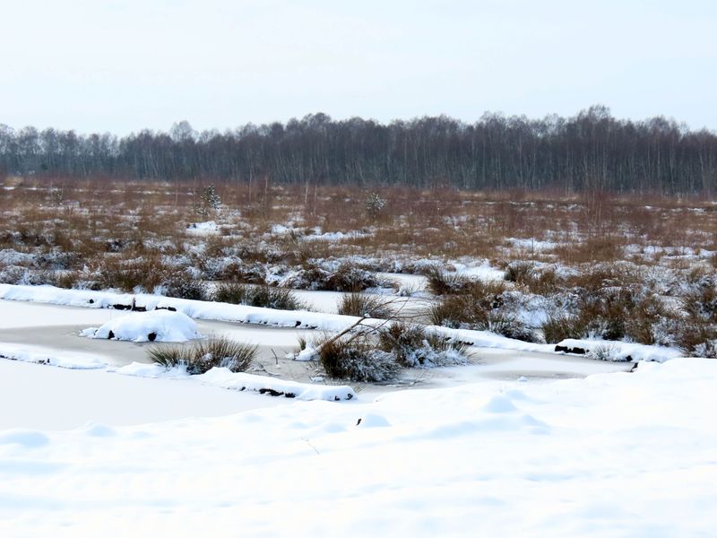 Im Großen Moor genügt es dagegen nicht, für die Renaturierung Entwässerungsgräben zu verfüllen. Wie an vielen Stellen in dem Gebiet schon sehr gut ersichtlich ist, müssen für die Hochmoorrenaturierung sogenannte „Pütten“ angelegt werden. In diesen teichartigen Wannen kann sich das Regenwasser sammeln – eine wichtige Voraussetzung dafür, dass sich die torfbildenden Sphagnum-Moose wieder ansiedeln können. Dieser Prozess lässt sich in seinen unterschiedlichen Entwicklungsstadien in den bereits angelegten Pütten gut nachvollziehen. Natürlich nur, wenn die Landschaft nicht gerade von einem weißen Schneekleid bedeckt ist.